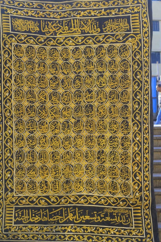 Behold this majestic Kiswa of the Holy Kaaba Door Cover, an extraordinary and sacred piece bearing the 99 Beautiful Names of Allah (Asma’ul Husna) — each meticulously embroidered with utmost reverence and precision onto this blessed textile
